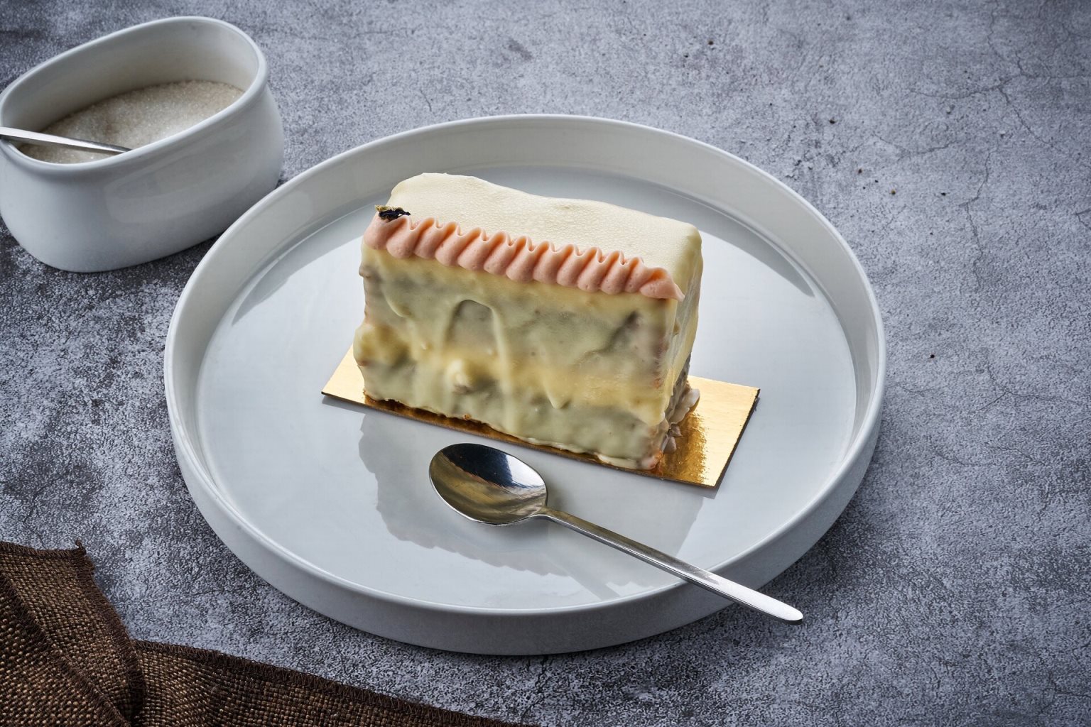 Медовик на основе гречишного меда, заварного крема с добавлением сгущенного молока и тонким ароматом ванили. Подаем с хрустящим кранчем из воздушного риса и фундучной пасты