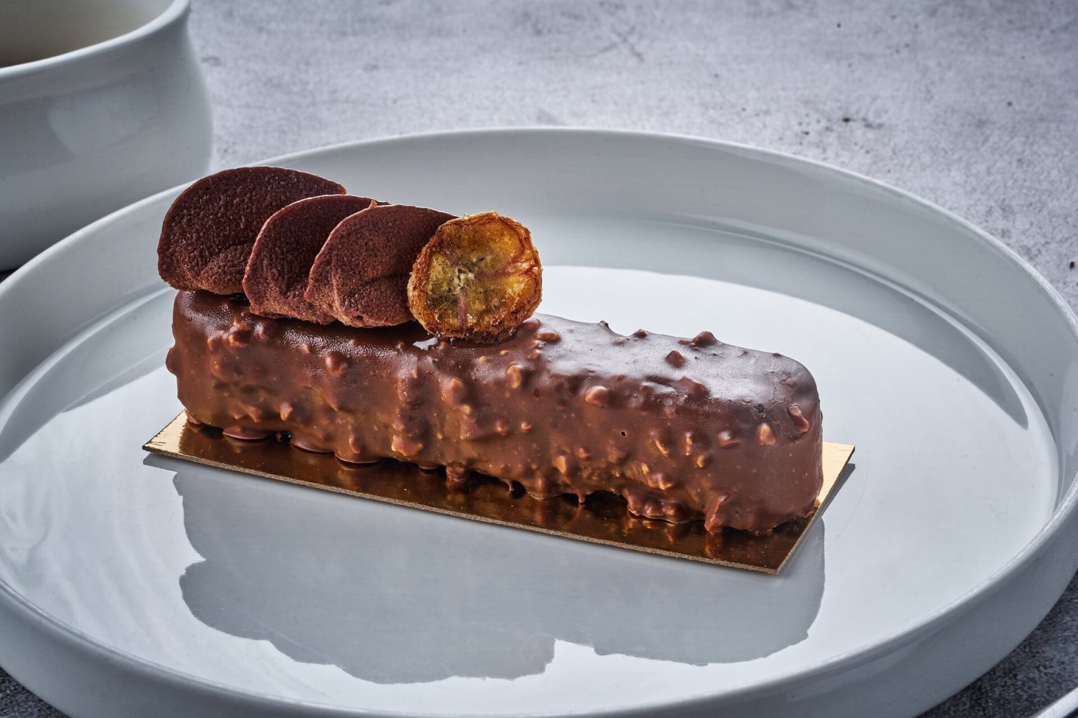 Шоколадно-банановый брауни, с кусочками свежего банана, украшен глазурью из грецкого ореха с кокосовым маслом