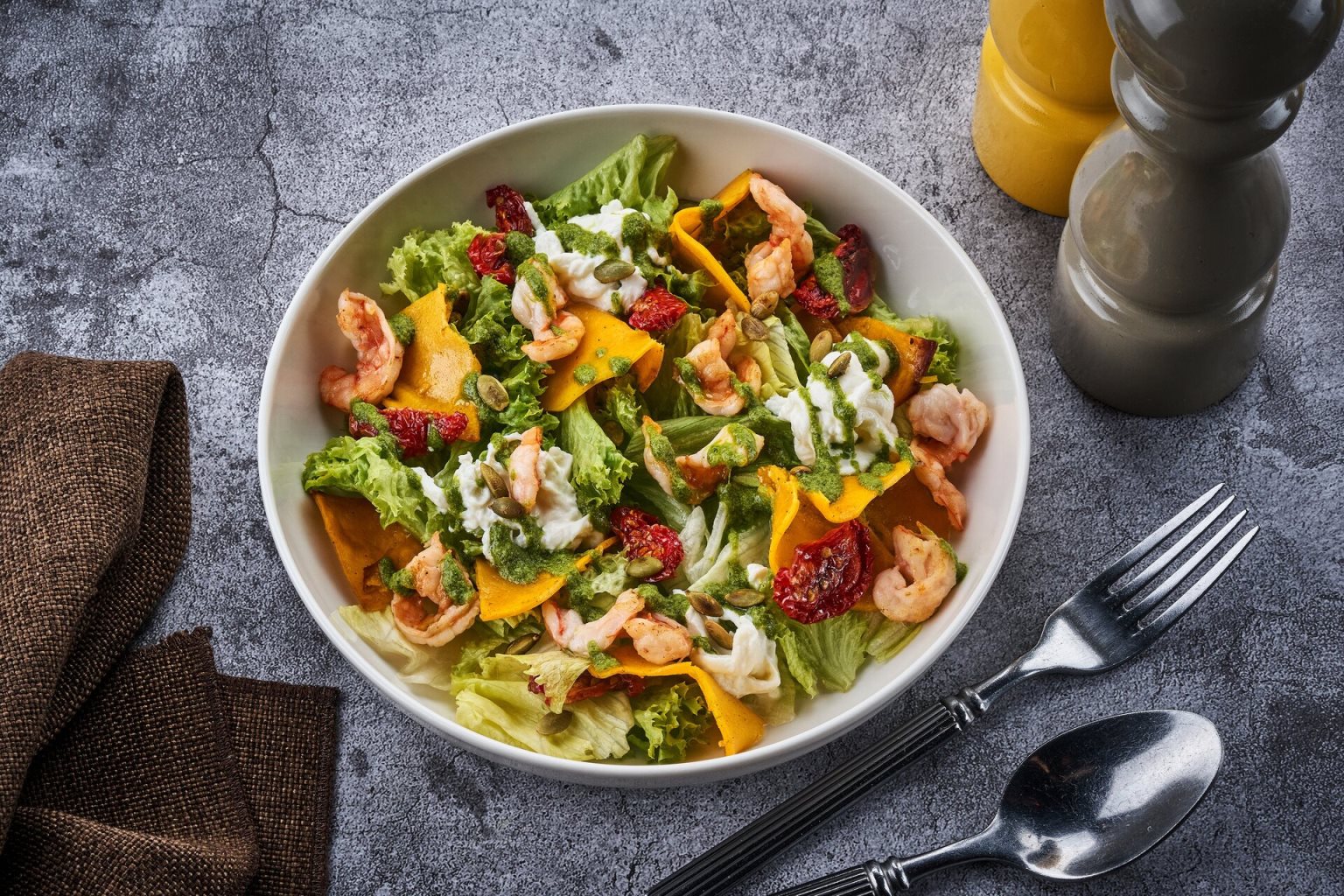 Салат с обжаренными креветками, запеченной с медом тыквой, сливочной страчателлой, листьями салатов и соусом Порто