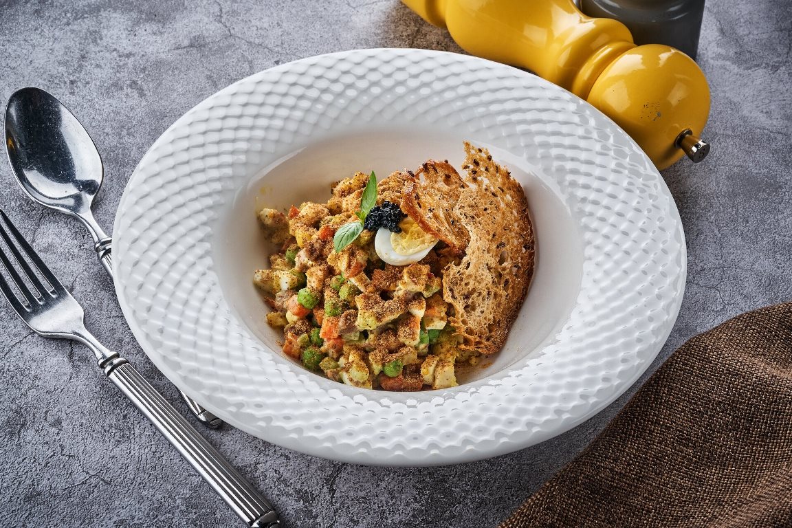 Салат с добавлением говяжьего языка, сочной куриной грудки, отварными овощами. Подается с хрустящими крутонами и икрой палтуса