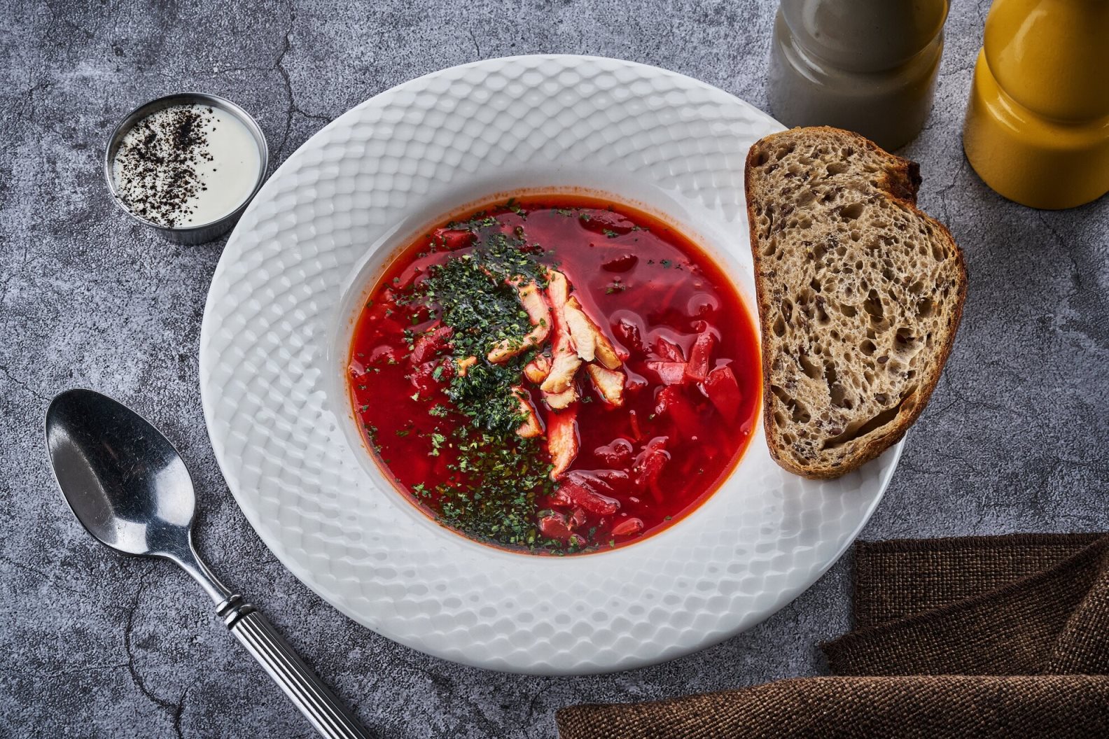 Классический борщ на курином бульоне. Подается с копченой сметаной и гречишнм медом